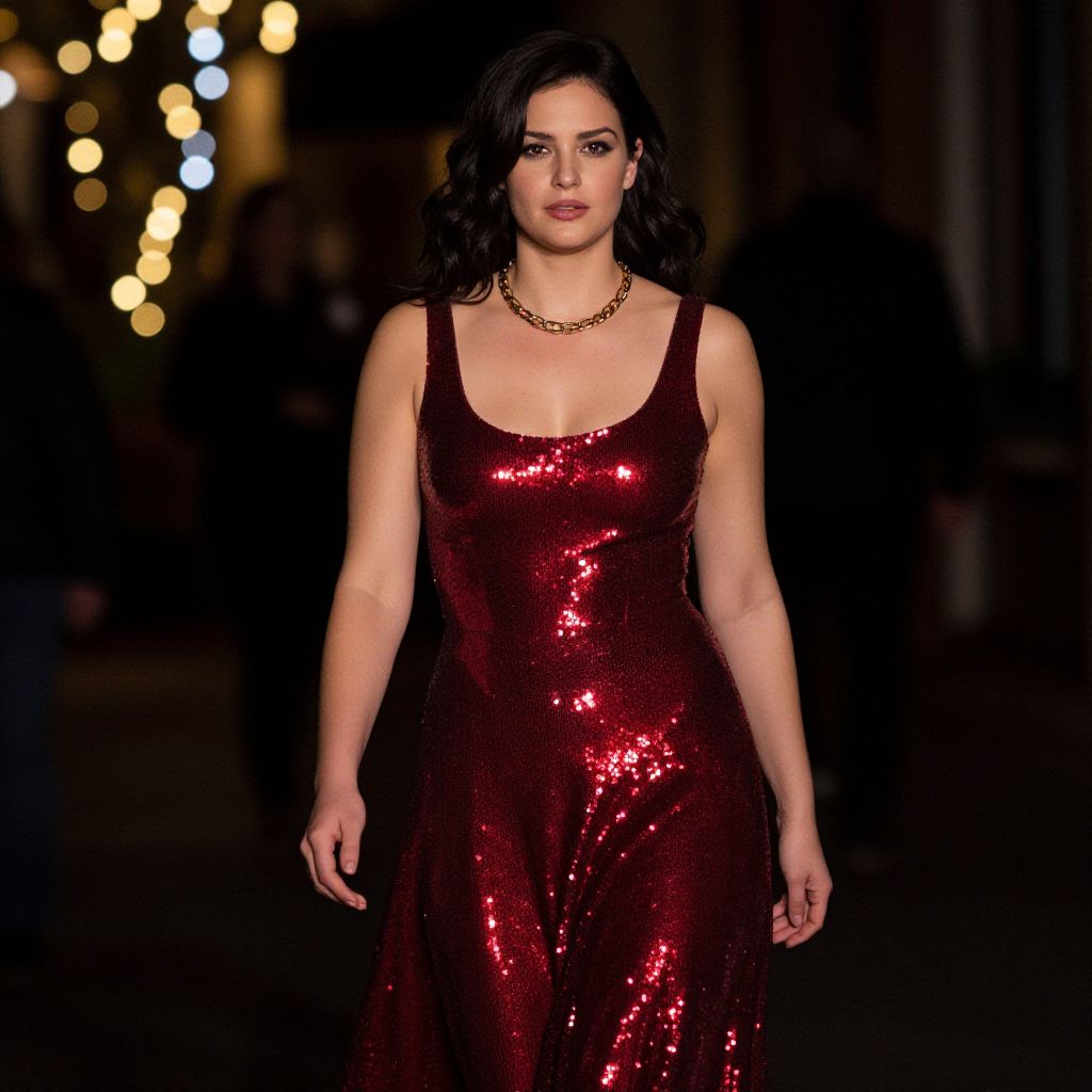 Photograph of a confident woman with long, wavy black hair, wearing a maroon turtleneck sweater and high-waisted black leather shorts. She's also sporting shiny black knee-high boots. She's walking past a row of yellow wicker chairs with cream upholstery, outside a glass-fronted building. The background shows a blurred reflection of a car and warm indoor lights.