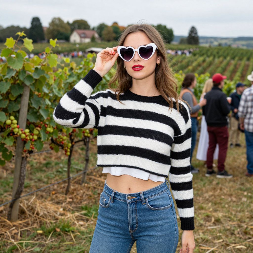 A petite woman in a technicolor analog film style, dressed in a striped black and white cropped sweater with a white shirttail hem and blue skinny jeans, enjoys a cultural celebration in a picturesque vineyard festival, wearing oversized heart-shaped sunglasses. Sexy. Pretty face and beаutiful eyes. Big breasts