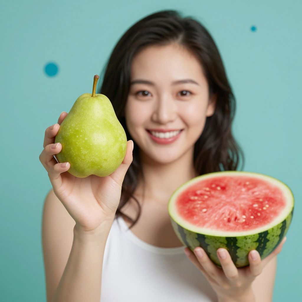 Smiling woman holding a vibrant green pear in her right hand and a halved watermelon with juicy red flesh in her left, set against a soft teal background with floating blue dots.