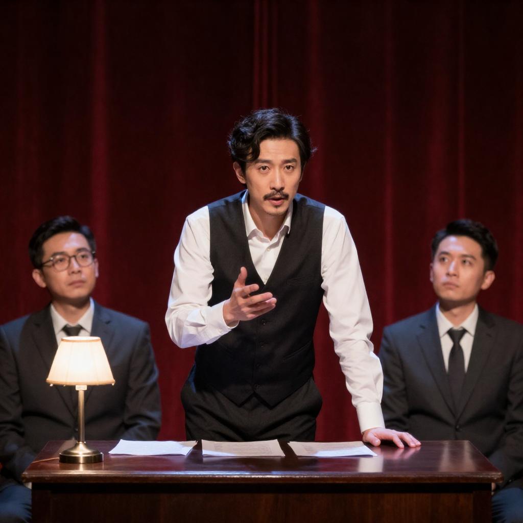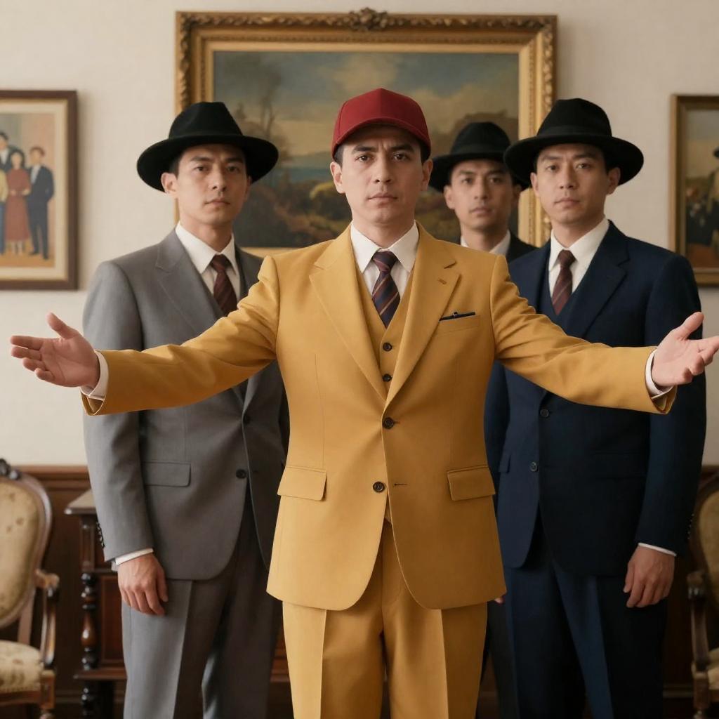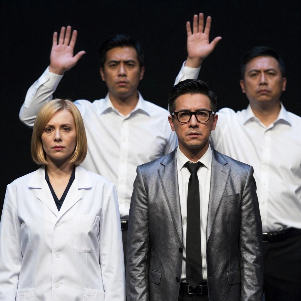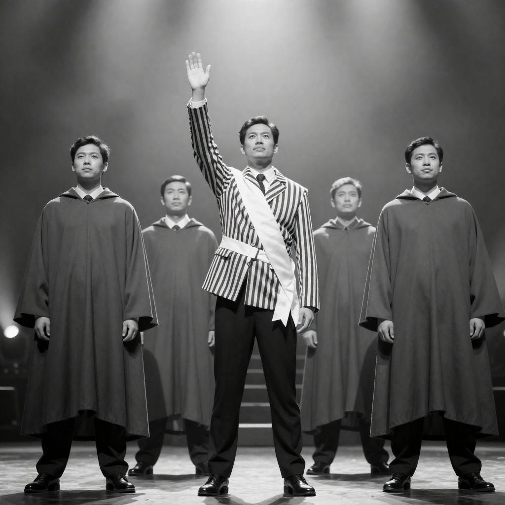 Black-and-white photograph of six men standing on a stage. One man in a tall, striped jacket and white sash stands tall with a raised arm, while the others wear long, draped cloaks. Radiant light shines from the background.