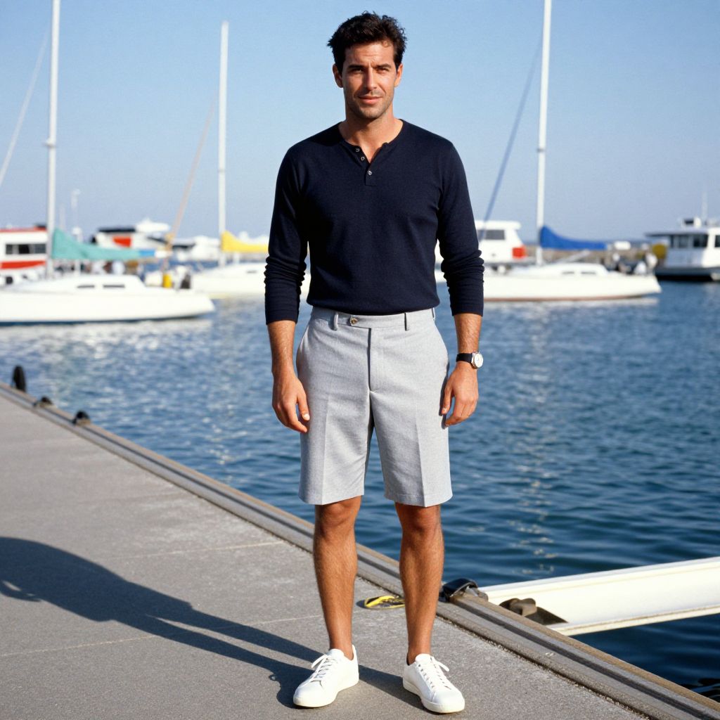 A man, dark navy long-sleeve henley, light grey tailored shorts, white leather sneakers, sun-drenched docks, colorful sailboats bobbing, ektachrome film stock, relaxed smile, casual elegance.Man has masculine face and piercing eyes
