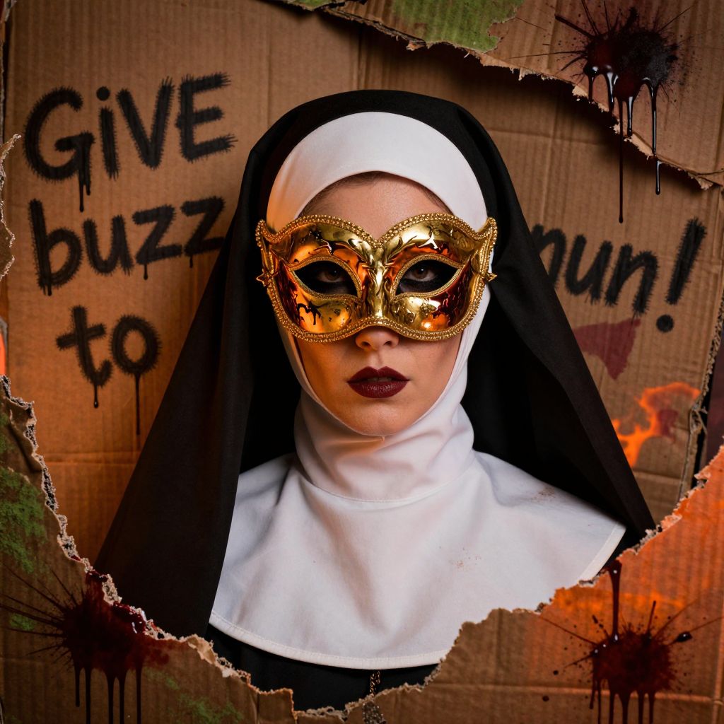 Envision a hyper-realistic digital artwork capturing the intense, cinematic scene of a nun’s face, She wears a traditional white habit and black veil, her expression partially obscured by a luxurious, golden mask, lavishly designed with grotesque elegance, The color scheme is drenched in vibrant oranges and deep blacks, casting an ominous, fiery glow over her, Surrounding her is an eerie setting—tattered, rotting cardboard panels, tinged with green mold and stained by dark, sprayed droplets of blood, Scrawled across the decaying cardboard, in smeared, dripping letters, is the phrase, “GIVE buzz to nun!” The unsettling graffiti adds a raw, rebellious edge to the glamorous yet grotesque scene, heightening the blend of fashion, mystery, and thrill, The composition feels both gritty and lavish, like a secret hidden within a twisted, high-fashion world