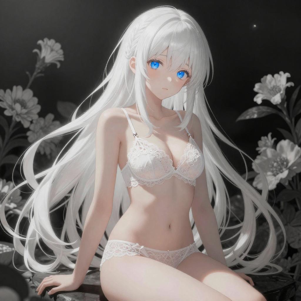 Digital artwork of an anime girl with long white hair and striking yellow eyes, wearing intricate black lace lingerie and a sheer top. She has blue feather hair accessories and is seated seductively on a bed with a black background. The image features detailed shading and soft lighting that emphasizes the delicate lace patterns and her bare legs and feet.