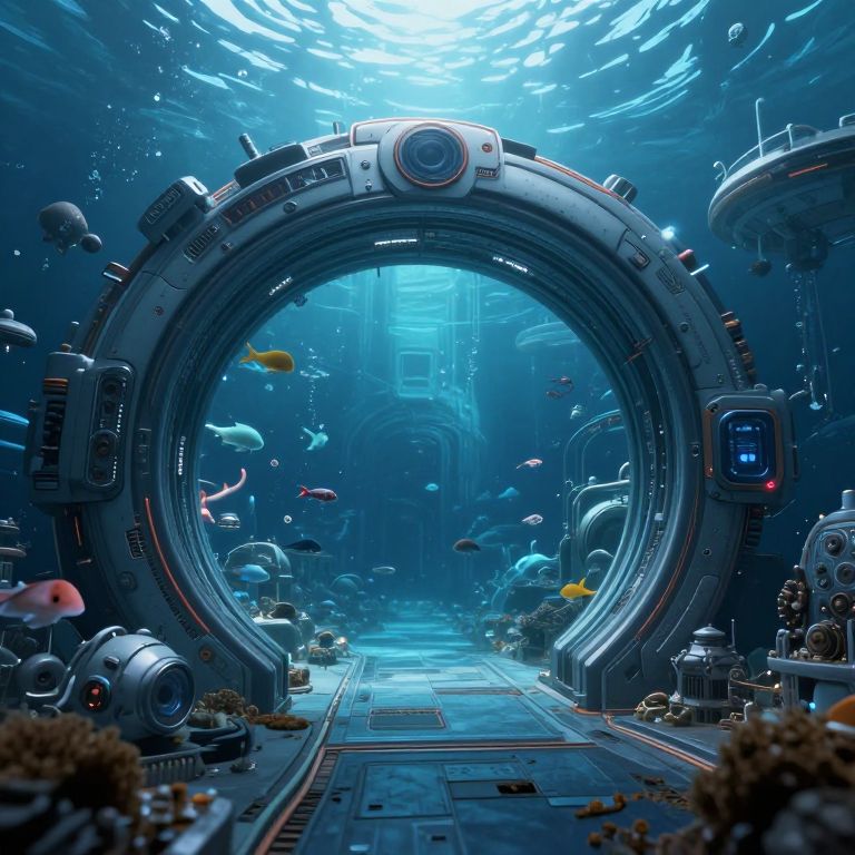 A futuristic underwater portal leads to a vast, otherworldly space station filled with marine life and advanced technology.