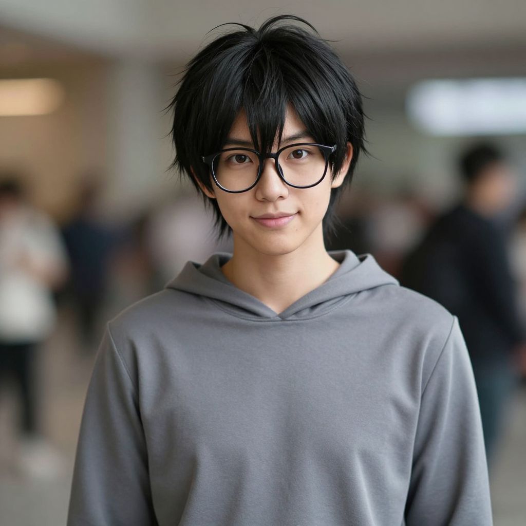 Photograph of a young Asian man with medium-light skin and black, slightly messy hair, wearing large black-framed glasses and a grey hooded sweatshirt. He has a subtle, neutral expression and is standing in a blurred indoor setting with indistinct people and lighting in the background. The focus is sharp on his face and upper body, while the background is softly out of focus, creating a shallow depth of field. His casual attire and slight smile give off a relaxed, approachable vibe. The lighting is natural, highlighting his face and hair.