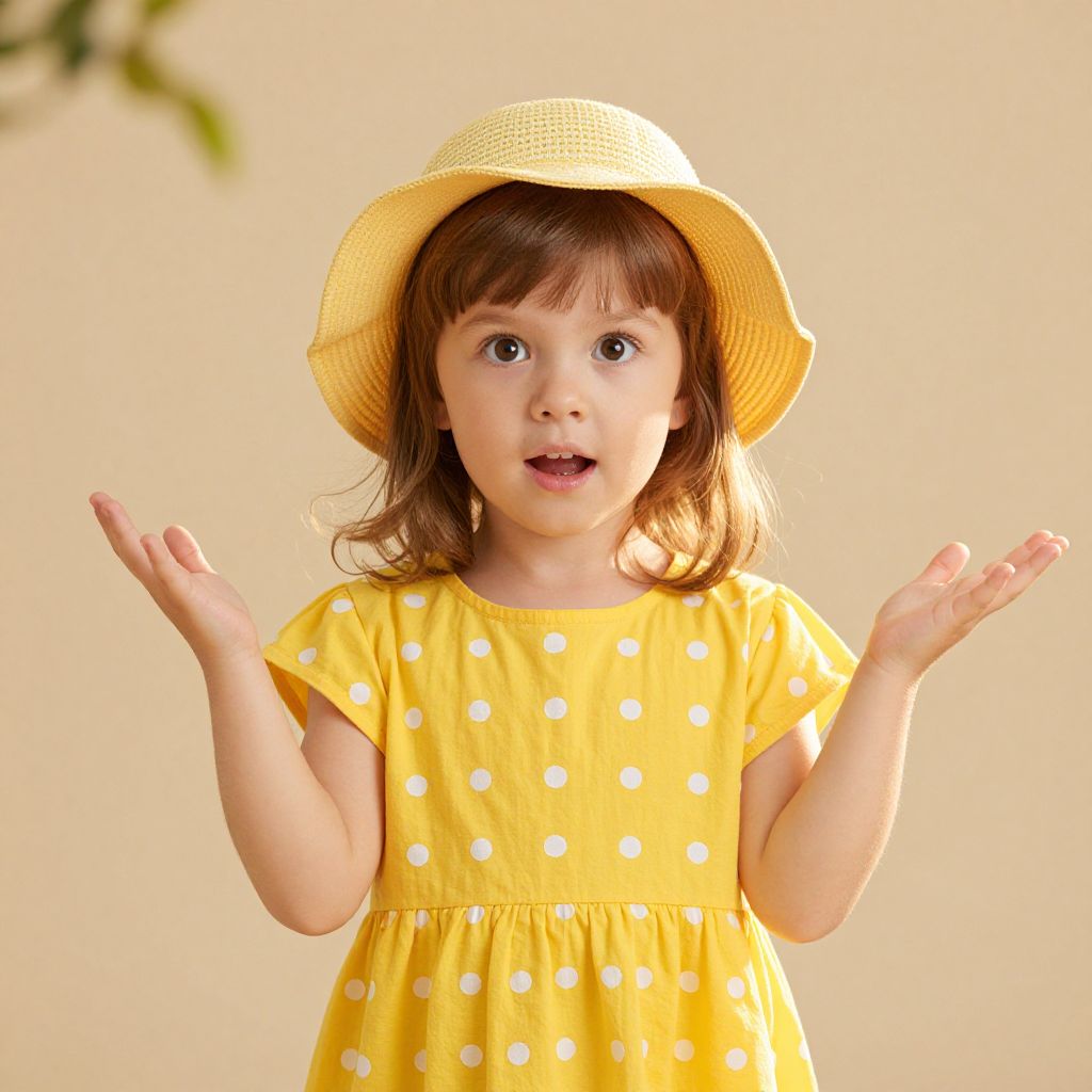 A young girl with bright, curious eyes and soft brown hair, wearing a yellow sunhat and a cheerful yellow dress with white polka dots, stands confidently against a warm, neutral beige background. Her small hands are slightly raised in a gesture of wonder, as if she's about to reach for something in the distance. The sunlight gently filters through the scene, casting soft, golden shadows and highlighting her joyful expression and the subtle sparkle in her eyes. The setting is simple and inviting, with a slightly blurred backdrop suggesting a peaceful outdoor environment—perhaps a park or a sun-dappled meadow—emphasizing her innocence, happiness, and quiet curiosity. The overall mood is warm, uplifting, and nostalgic, capturing a moment of pure childhood wonder.