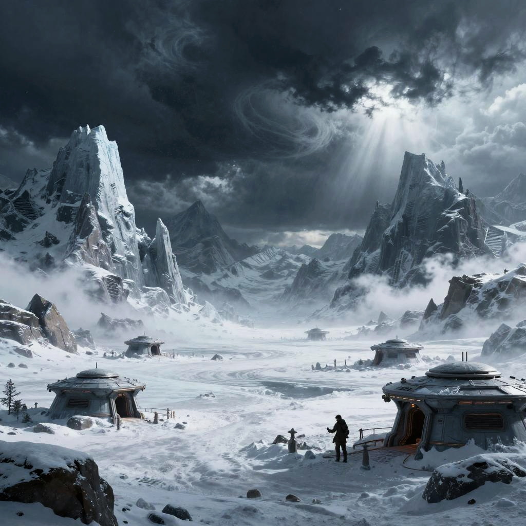 Star Wars landscapes of icy tundras with jagged frozen mountains, scattered rebel outposts, swirling snowstorms, dramatic sky, cinematic sci-fi art style, intense epic vibe