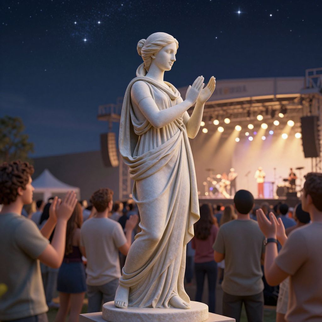 A computer-generated, high-definition 3D render depicts a classical statue of a woman, draped in flowing robes, standing amidst a crowd of modern-day concertgoers under a starry night sky, as she claps along to the music emanating from a distant stage illuminated by golden-hour lighting, symbolizing the surreal fusion of ancient art and contemporary life.