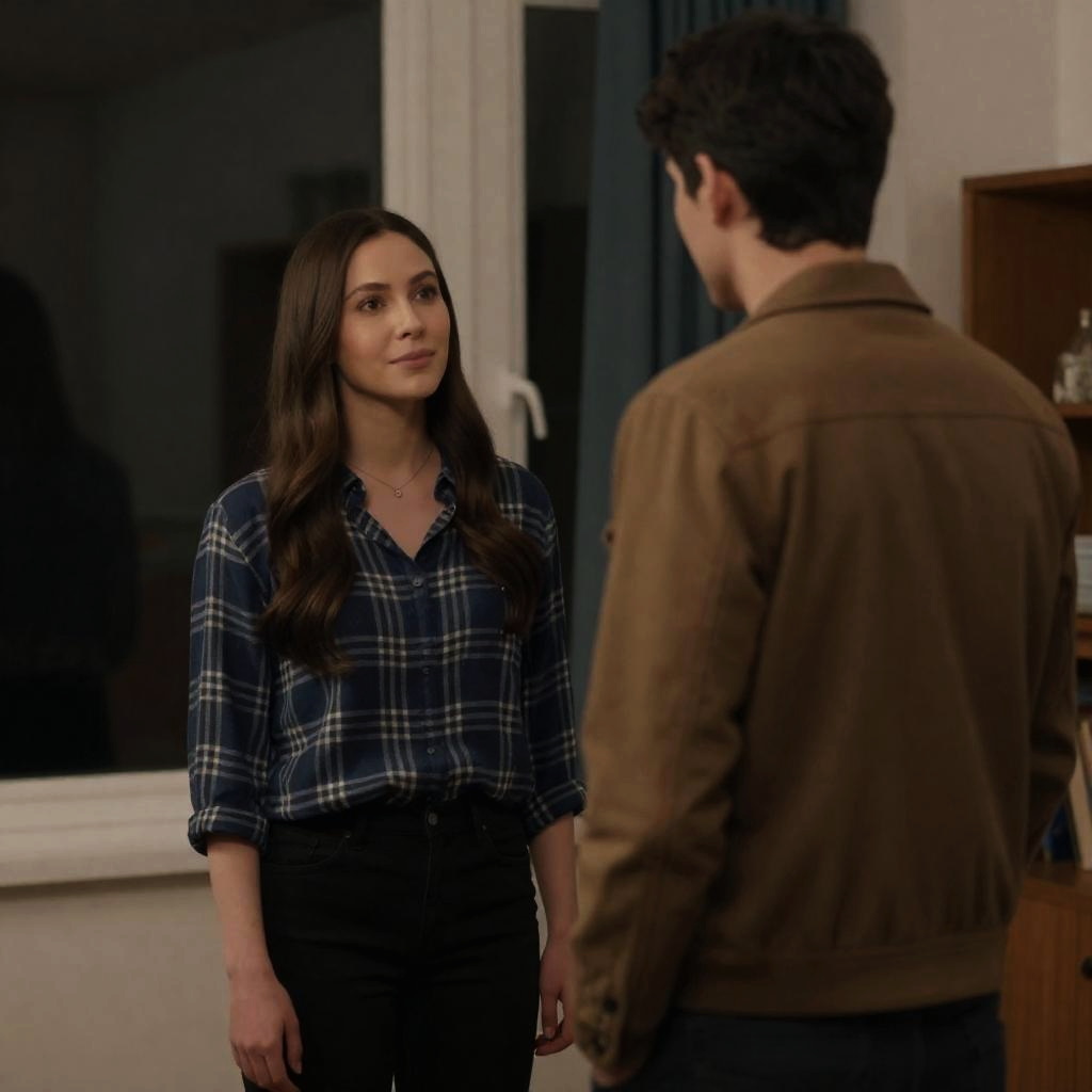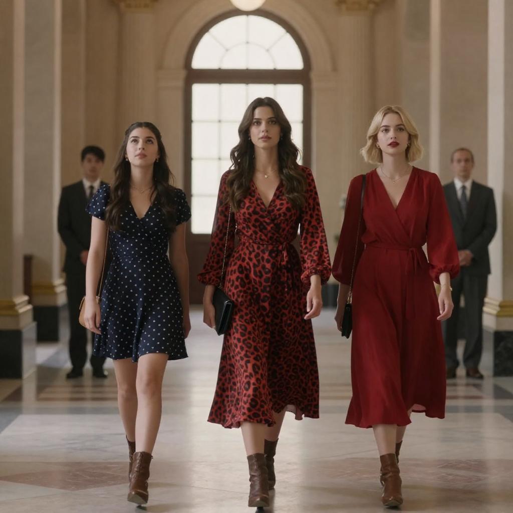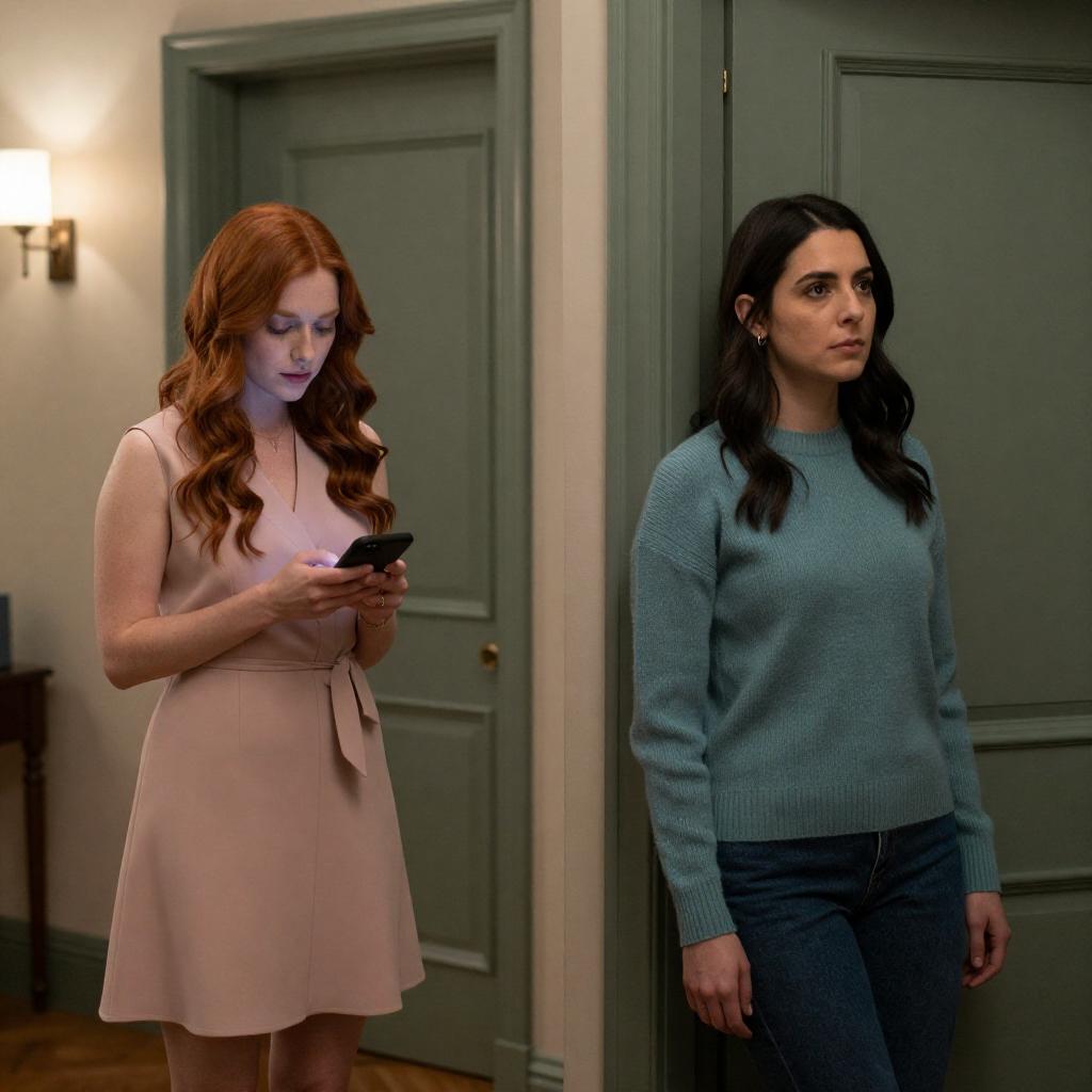 Photograph of two women. Red-haired woman in light pink dress holds phone, standing near green door. Dark-haired woman in teal sweater leans against adjacent green door. Warm indoor lighting. Red-haired woman's focused expression. Dark-haired woman's neutral expression. Green doors with vertical panels. Wooden floor. Wall-mounted light on left.