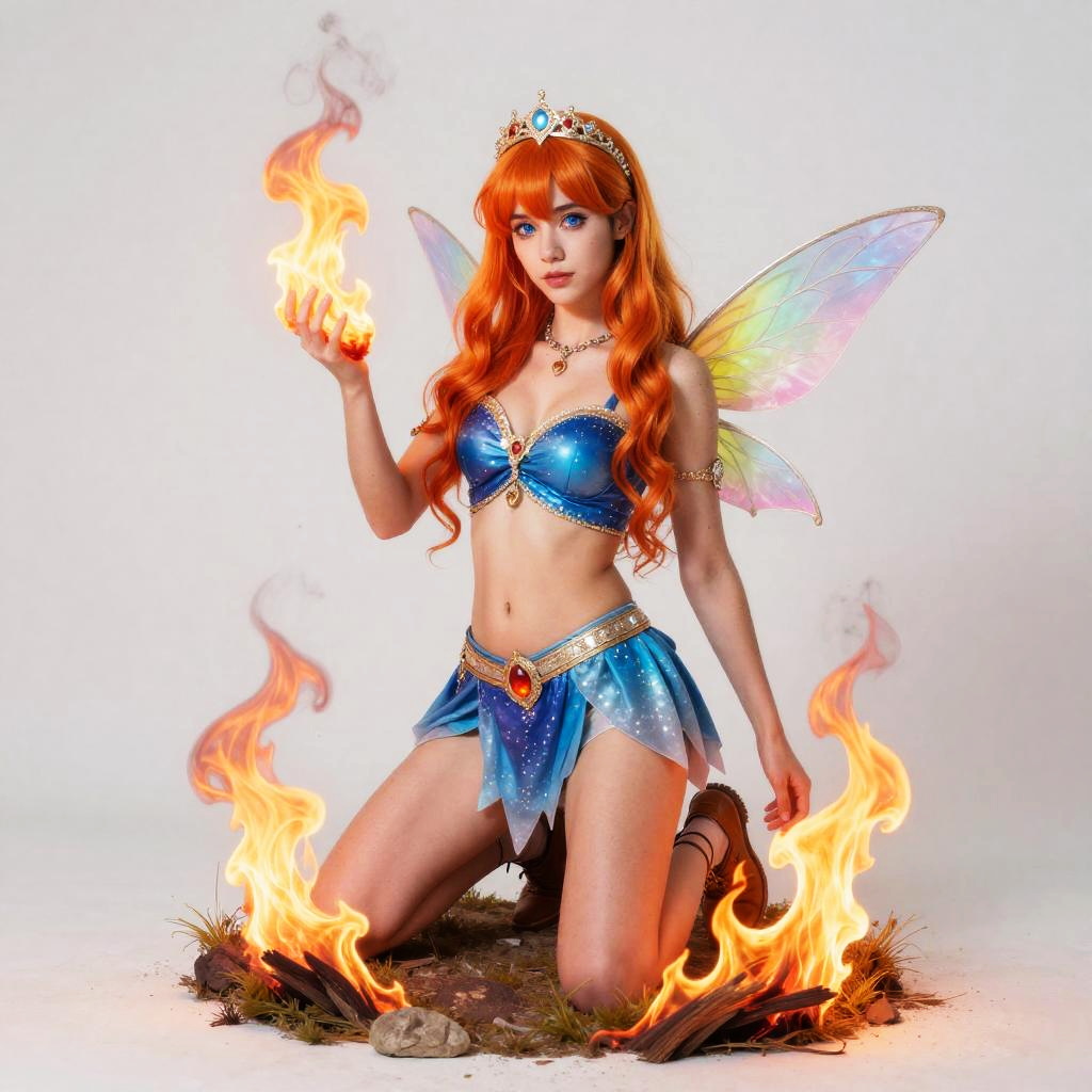 ((masterpiece)), (best quality), official art, extremely detailed CG, unity 8k wallpaper, ultra detailed, highly detailed, detailed background, vivid color, photorealistic, perfect lighting, best illumination, 32k, S030_EkaterinaShiryaeva, (Dark Bloom), (orange hair, yellow iris, bangs, long hair), (fairy outfit), (black skirt, gloves, black shirt, sparkling clothing, fairy wings, tiara, gems, glitter), right hand behind her head, looking at ciewerwhite background, plain background, solid color background, knee-up-shot, neon lighting, dark romantic lighting, gradients, dynamic pose, prettify, OverallDetail, prettyeyes, SkinDetail, fFaceDetail