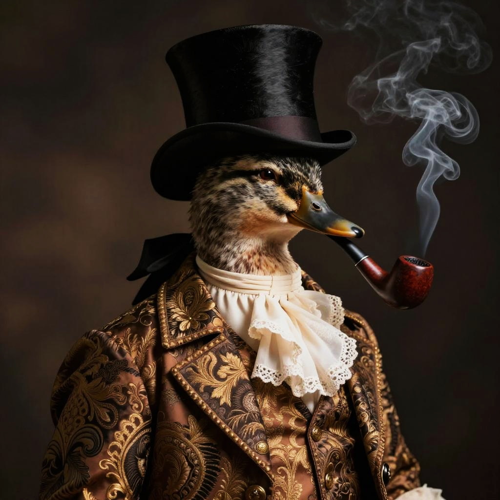 A realistic detailed portrait of an elegant duck wearing a vintage baroque-style brocade suit and tall top hat, smoking a pipe with visible smoke, intricate textures and rich warm earthy colors like brown and gold, dark background, cinematic lighting, highly detailed feathers and fabric patterns