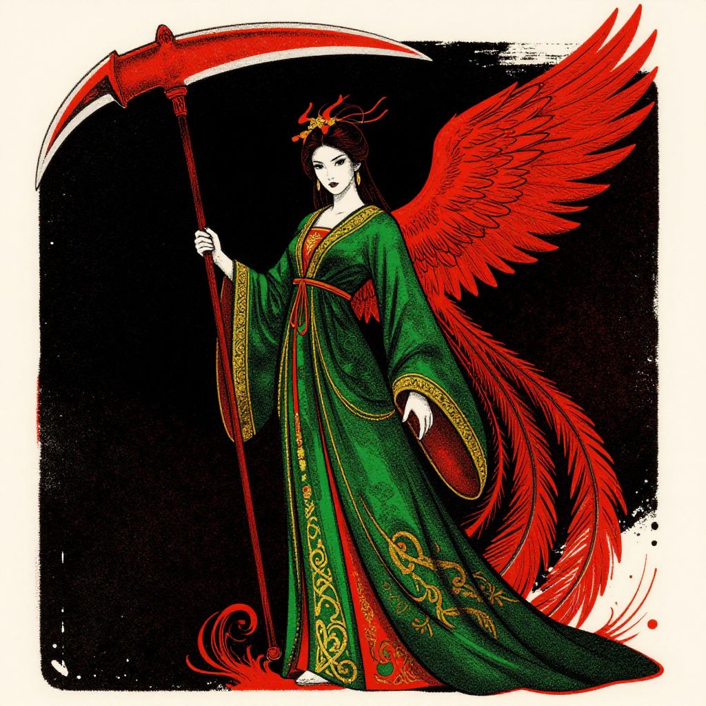 Screen print style portrait of a mystical phoenix-themed woman dressed in a long flowing green and red robe with gold detailing. She holds a large red scythe and a sword in dynamic pose. The design features bold black, red, and green colors with matte finish, highlighting intricate feather and fabric patterns. The image is inspired by the illustrative styles of Victo Ngai, Karolis Strautniekas, and Loish.