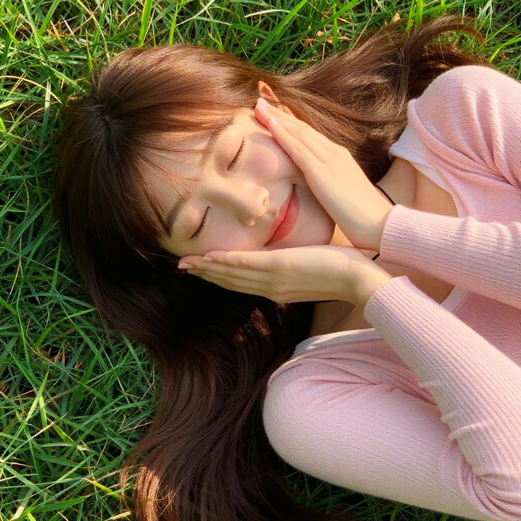 Photograph of a young woman with fair skin and long brown hair lying on green grass. She's wearing a pink ribbed sweater over a white shirt, eyes closed, and smiling gently. Her hands are resting on her cheeks, and a thin black cord is visible near her neck. The sunlight casts soft shadows, adding warmth to the image.