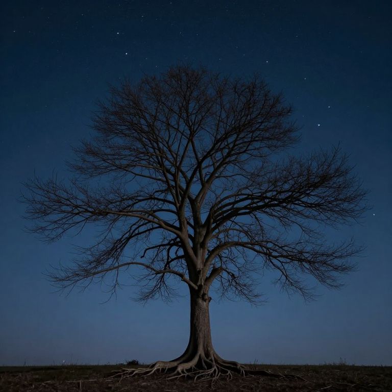 Lonely tree stands bare against a star-studded night sky, its intricate network of branches reaching outwards, roots firmly anchored in the earth below, while whispers of celestial light float silently around it.