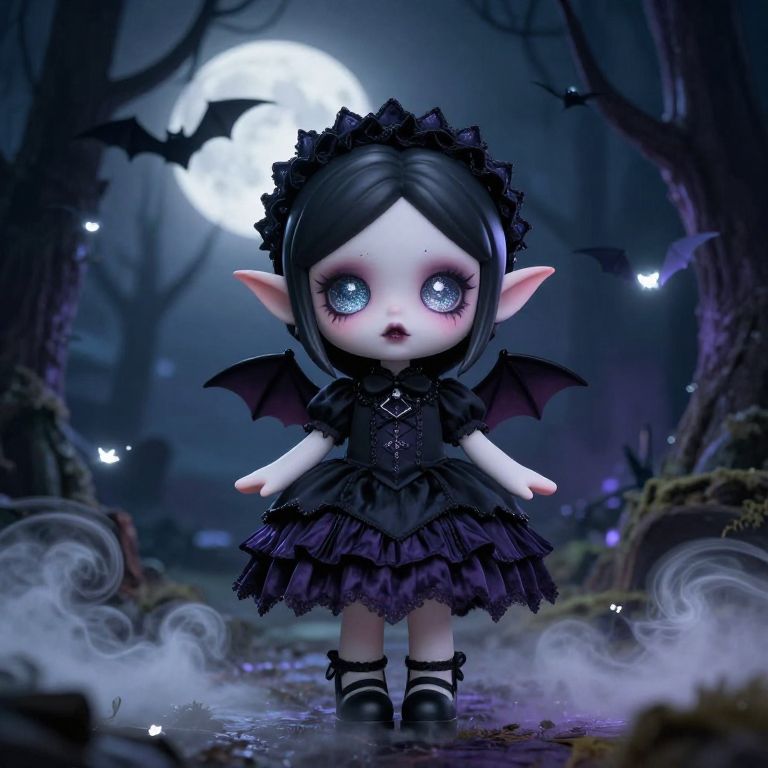 Cute vampire girl with pale skin and large shimmering eyes, dressed in gothic lolita fashion, standing in a moonlit haunted forest with glowing bats fluttering around, soft mist swirling at her feet, whimsical and enchanting atmosphere.