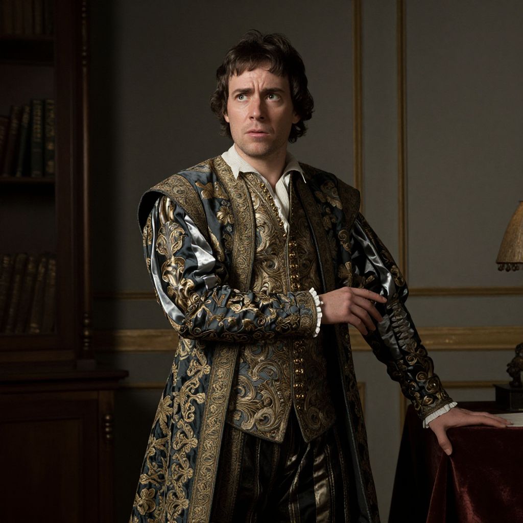 Tybalt's conflicted noble figure standing alone in a dimly lit room, ornate period costume with intricate embroidery, expressive pose showing inner turmoil, classical painting style with soft shadows and rich, muted colors.
