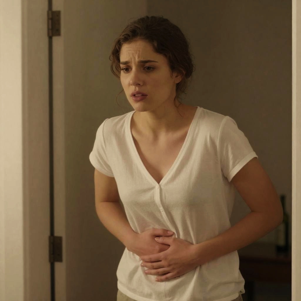 Photograph of a young woman with fair skin and brown hair in a loose bun, wearing a white, short-sleeved, V-neck blouse. She stands in a dimly lit doorway, holding her stomach with both hands, looking slightly worried. Background includes a bottle on a table to the right and a door frame on the left. Warm yellow light illuminates her from behind.