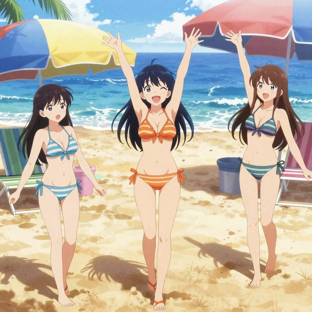 Bikini anime girls enjoying a vibrant summer beach scene, colorful umbrellas and clear blue waves in the background, detailed art style with dynamic poses and playful expressions, bright sunny day with soft shadows and warm tones.