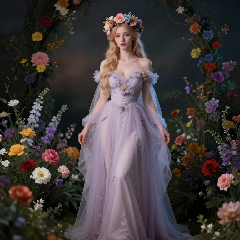 Photograph of a blonde woman in a lavender, off-shoulder floral gown, wearing a colorful flower crown, standing amidst a vibrant, multi-colored