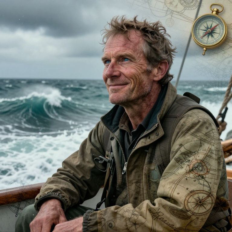Craft an intricate double exposure portrait of an eccentric tidal researcher with a rugged, lined face and piercing blue eyes. The subject sits against a backdrop of a stormy sea, waves crashing dramatically behind them. Their expression is one of stoic resilience as they smile and gaze out at the tumultuous horizon. Seamlessly blend ancient nautical maps and compasses into the image, overlaying the happy researcher to create a sense of navigation and exploration intertwined with their weathered visage. This merging conveys enduring courage and steadfast determination in the face of adversity, as stormy seascape and intricate map patterns interlace and blur around them, encapsulating the journey through life's tempestuous voyage.