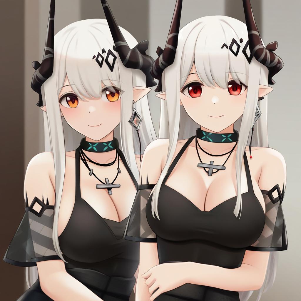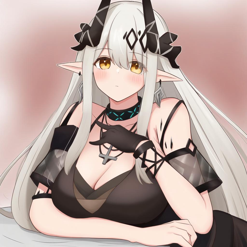Mudrock (obsidian) (arknights), arknights, 1girl, pointy ears, horns, red eyes, white hair, very long hair, grey hair, long hair, hair ornament, large breasts, cleavage, black dress, black gloves, bare shoulders, black choker, detached sleeves, short sleeves, necklace, earrings, single glove, by artist mana (tsurubeji), leet