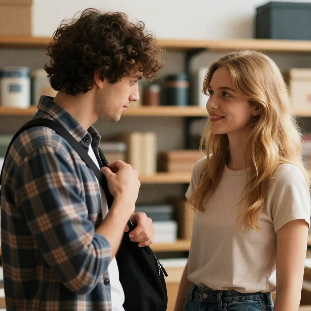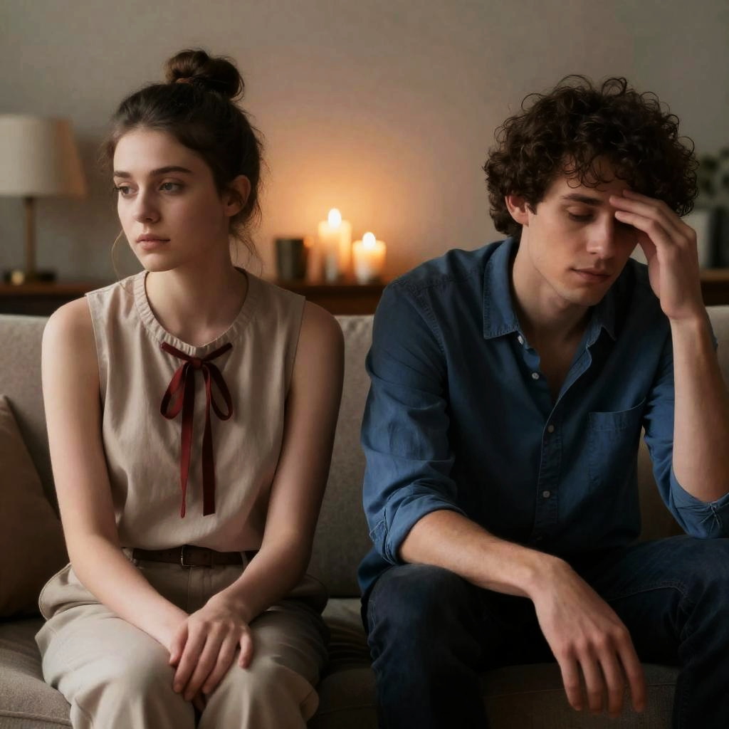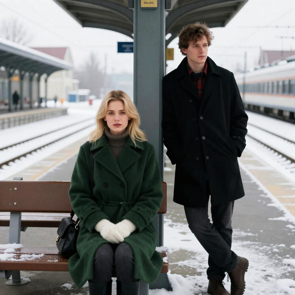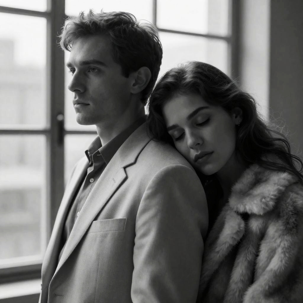 Photograph of a man and woman sitting on a yellow-benched, white-walled bus. The man, with a brown leather jacket and black hat, looks up with a neutral expression. The blonde woman, with closed eyes and red lips, leans her head on his shoulder. She wears a dark green top. The man's arms are crossed. The background includes a yellow horizontal bar and a wall socket on the left.