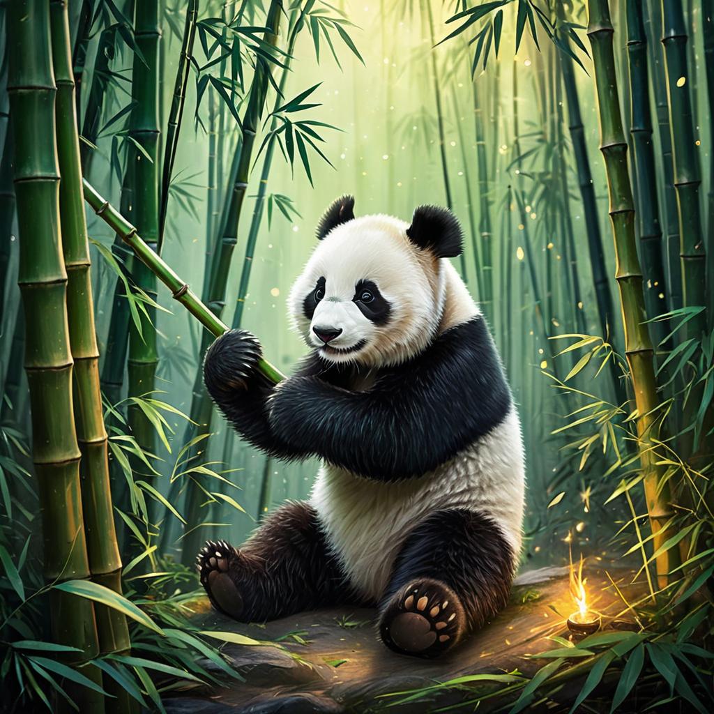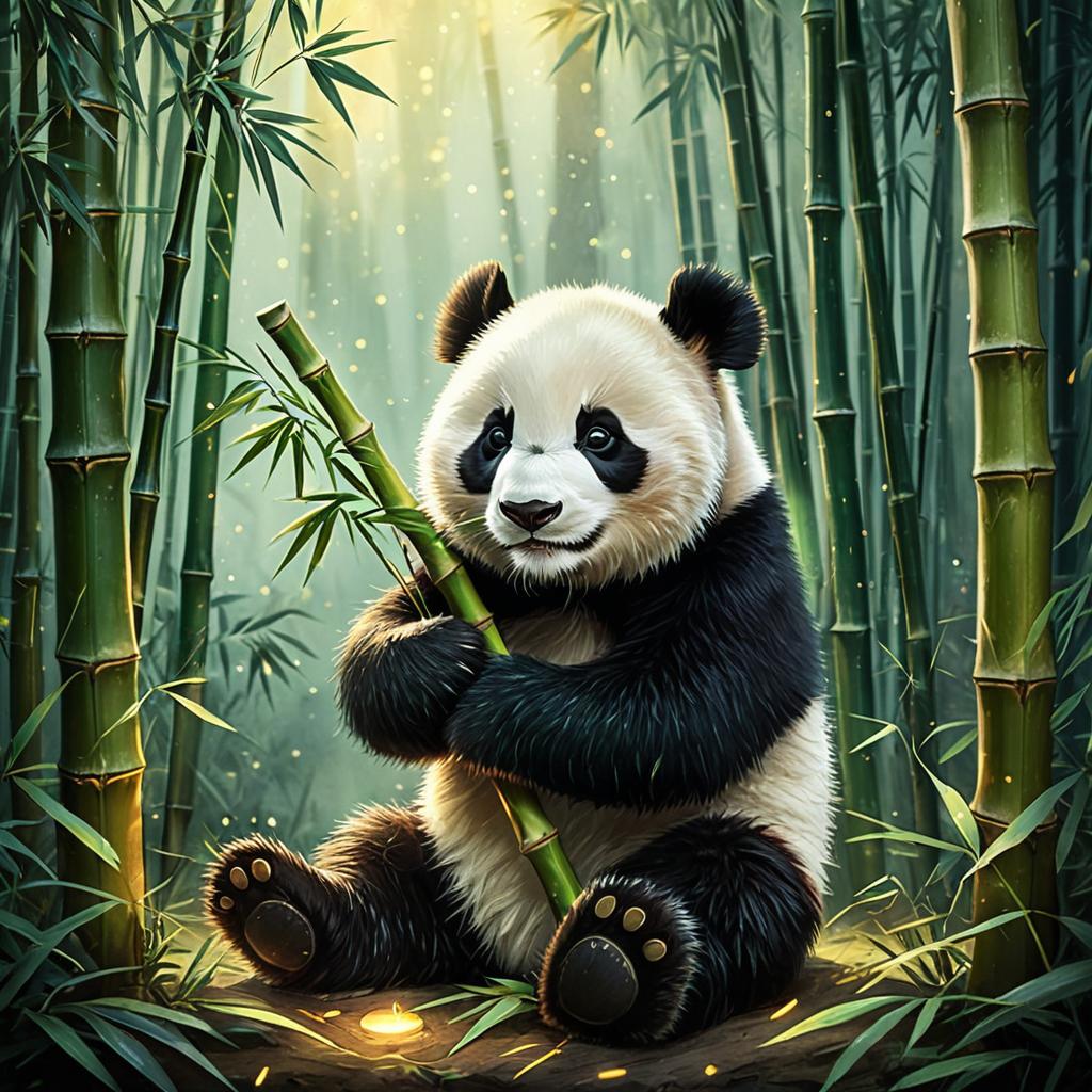 Playful baby panda hugging a bamboo stalk in an enchanted bamboo forest with misty morning light, rendered in detailed digital painting with soft brushstrokes with glowing fireflies and a gentle warm color palette.