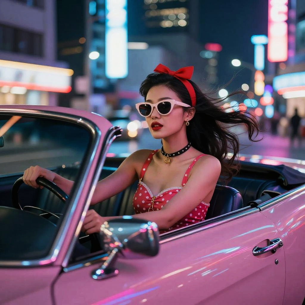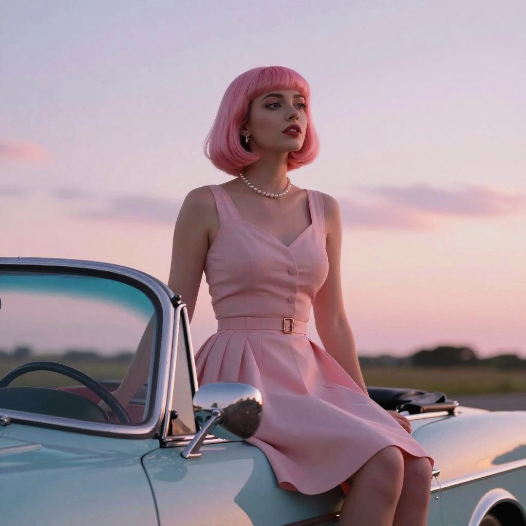 Girl with pink bob wearing vintage 1950s dress, sitting on a retro convertible car, pastel-colored sunset sky, soft lighting, nostalgic and dreamy vibe