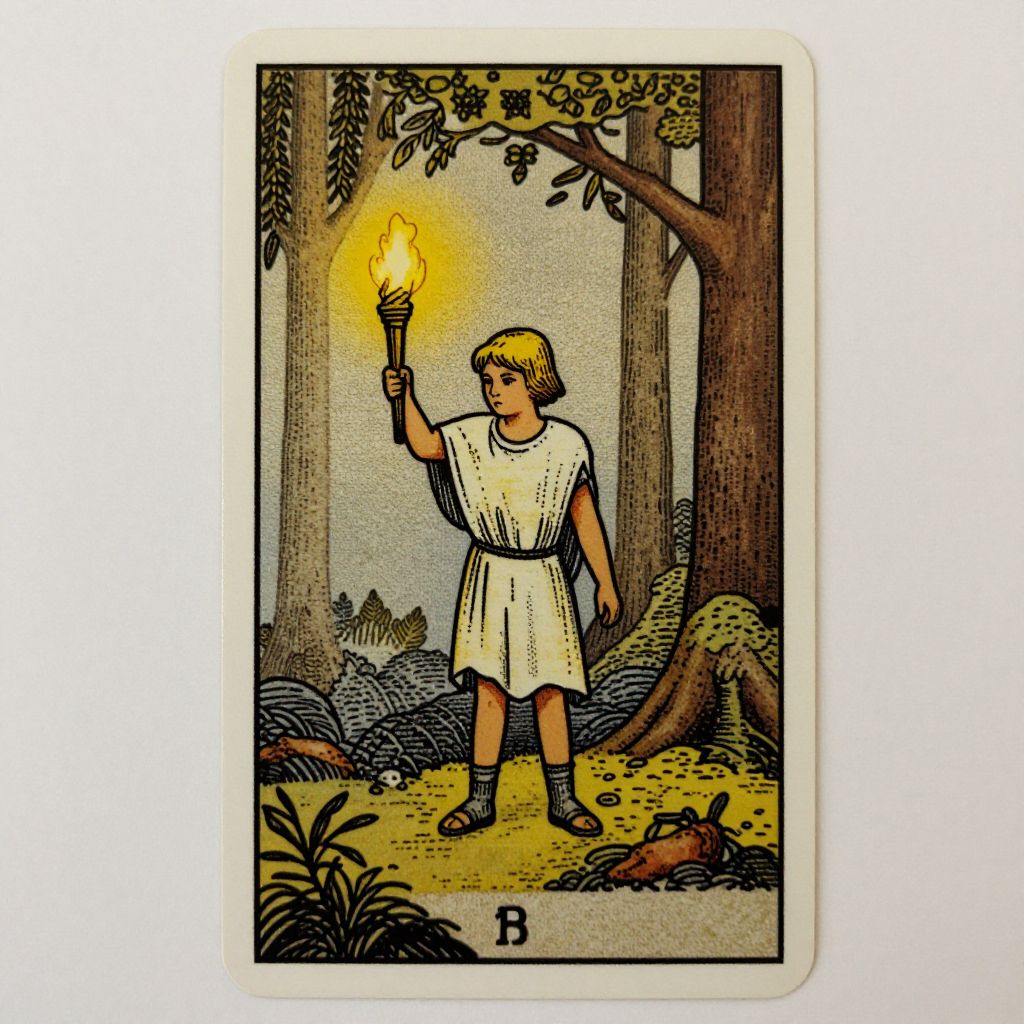 The image depicts a gold and black tarot card featuring a detailed, intricate illustration. The central figure is a child, dressed in a coat and hat, holding a torch that casts a warm glow, illuminating the surrounding forest path. The child stands amidst tall grasses and wildflowers, with trees and foliage forming a dense, natural backdrop. The card's gold-ink outline highlights the contours and details of the scene, creating a striking contrast against the black background. The overall composition is balanced, with the child positioned slightly off-center, drawing the viewer's eye through the scene. The card's texture appears smooth, with the gold ink adding a subtle sheen, while the black areas provide a rich, dark contrast. The interplay of light and shadow enhances the depth and dimensionality of the illustration, creating a sense of mystery and intrigue.