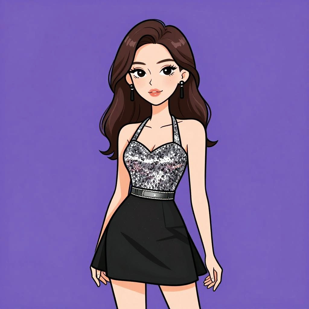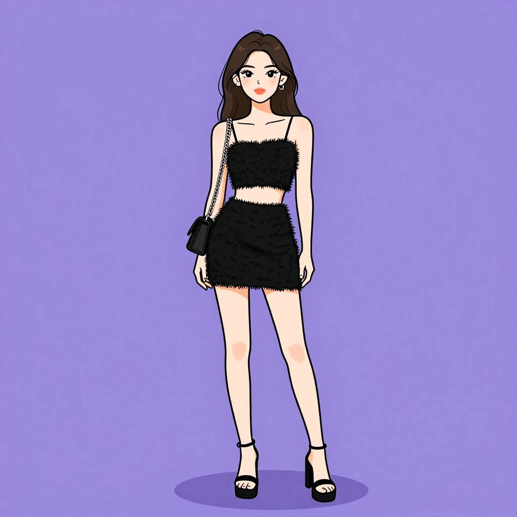 Woman with pretty face and pretty hair. Woman, evening wear, black lace overlay dress, sleeveless, scoop neckline, fitted bodice, scalloped hemline above the knee, white crossbody bag with gold chain strap and clasp. --sref 1467