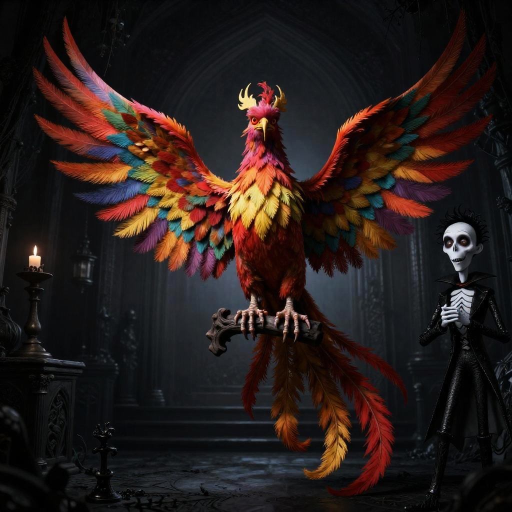 Photorealistic CGI image of a vibrant, mythical bird with large, colorful wings in hues of red, orange, yellow, green, and blue, standing on one leg in a dark, gothic cathedral. The bird has a fiery crest and a fierce expression. To the left, a lit candle on a black, ornate table. To the right, a skeletal figure in a black, Victorian-style suit stands. The background features dark, arched windows and stone walls, adding to the eerie, mystical atmosphere. The bird's feathers are highly detailed, contrasting with the stark, shadowy environment.