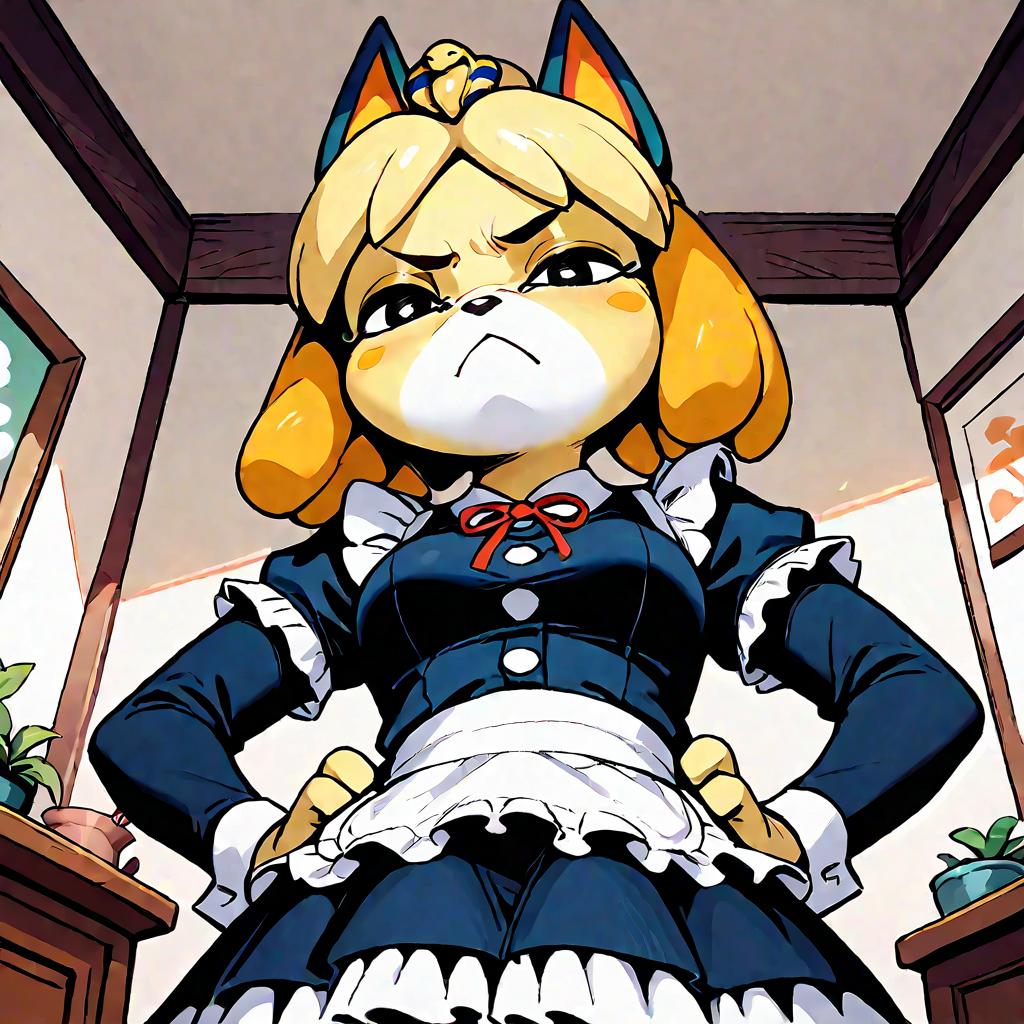Score 9, score 8 up, score 7 up, score 6 up, score 5 up, score 4 up, source furry, (duo), indoors, grumpy, skimpy, standing back to back and female ankha \(animal crossing\), maid, looking at viewer, crossed arms, medium breasts and female isabelle \(animal crossing\), hands on hips, disgust, looking down, from below, stepped on pov