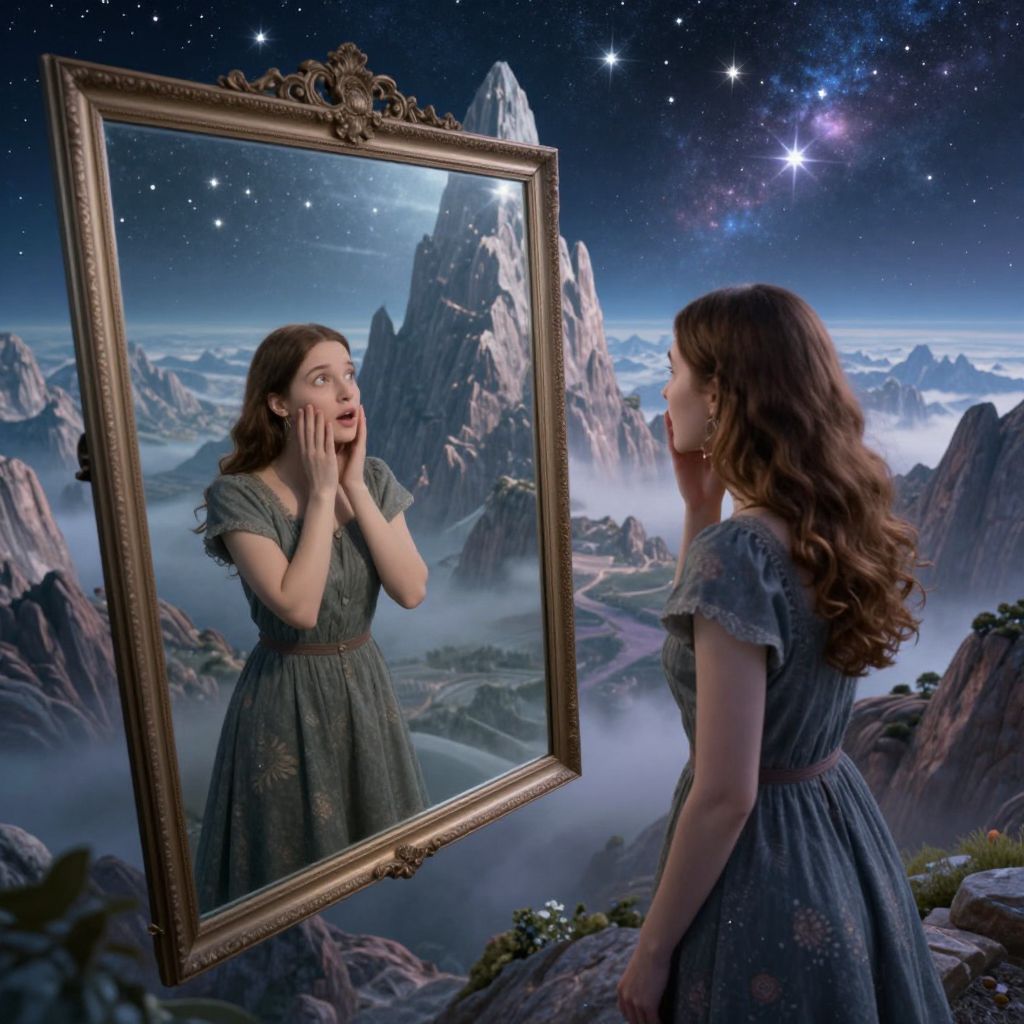 Craft an image that embodies surrealistic principles, featuring a woman positioned before a grand mirror, yet instead of her reflection, it portrays an expansive, fantastical landscape with towering peaks and twinkling stars. This scene should be captured from an unconventional viewpoint, as if observed from above, to amplify the feeling of grandeur and enigma. The artwork should evoke a spectrum of emotions ranging from amazement to introspection, seamlessly merging the self-reflective nature with the awe-inspiring vastness of celestial wonders in a hyper-realistic yet dreamlike manner.