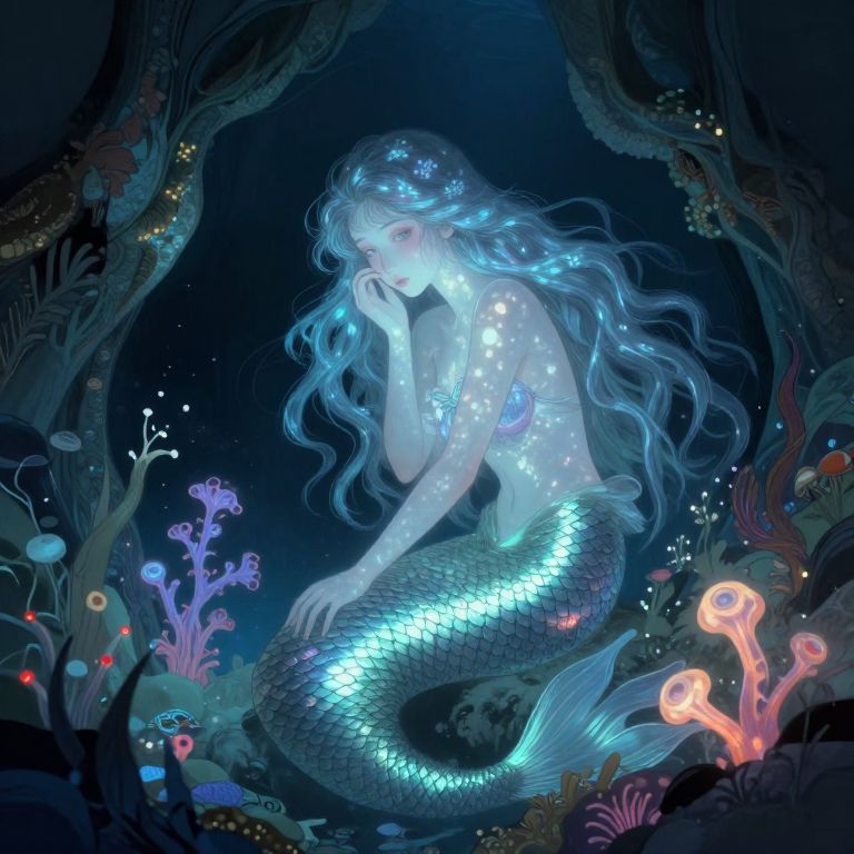 Digital illustration of a luminous mermaid with long, flowing blue and white hair, glowing with star-like sparkles. She has a slender, fair-skinned upper body and a shimmering, iridescent blue fish tail. She sits gracefully amidst a vibrant underwater scene, surrounded by colorful coral, jellyfish, and bioluminescent plants. The background is a deep blue, with dark, twisted tree-like structures framing the top. The mermaid's expression is serene, and her glowing hair and tail create a magical, ethereal effect. The style is whimsical and fantasy-like, with a focus on light and color.