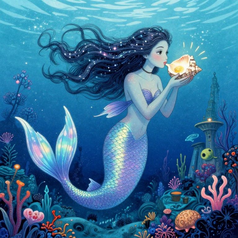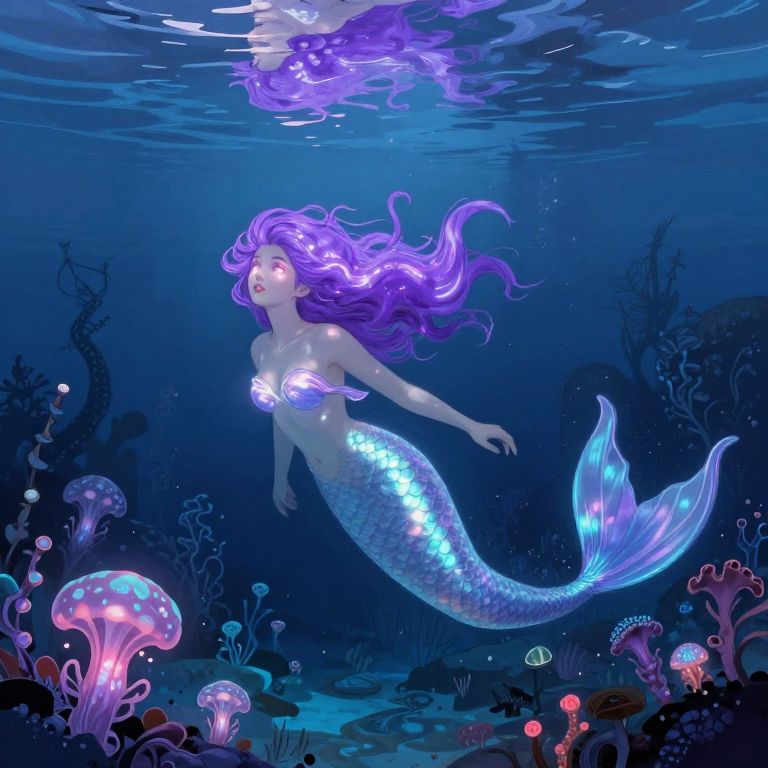 Digital artwork of a glowing, blue-haired mermaid with a shimmering, iridescent tail, surrounded by vibrant, bioluminescent sea creatures