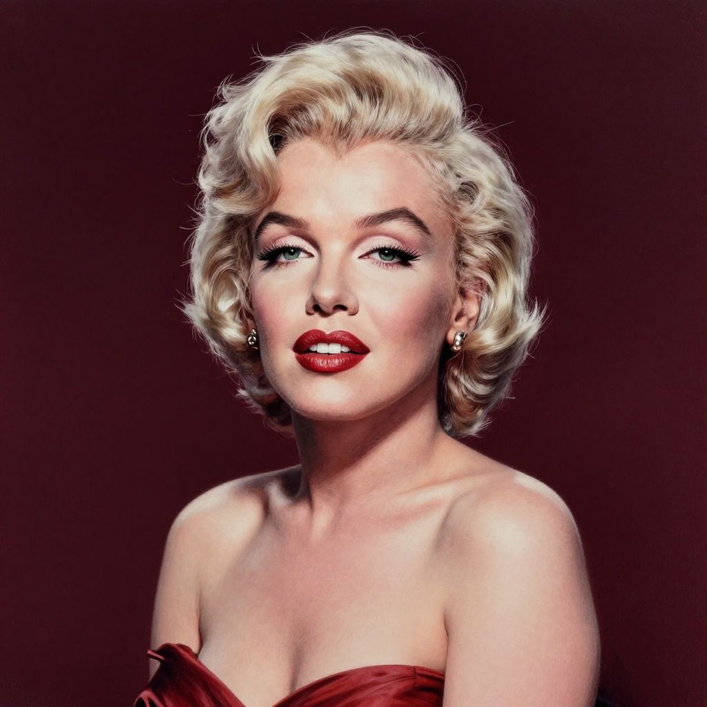 Ultra realistic full body color pencil drawn portrait of Marilyn Monroe, beauty and glamour style, Deep dark burgundy background, Dark theme, dynamic lighting, (soft shadows), (soft focus), (photo realistic), uhd, 8k