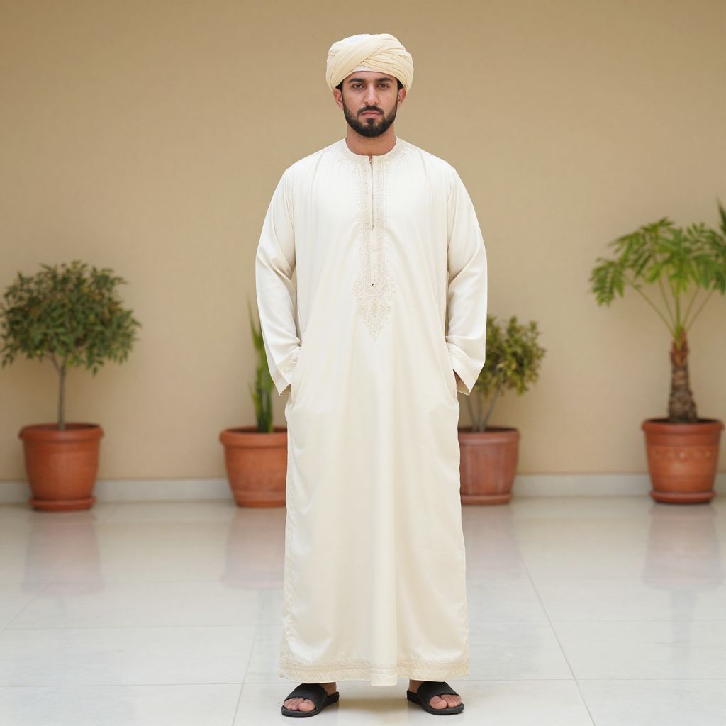 Photograph of a bearded man standing outdoors on a tiled patio. He's wearing a long, cream-colored traditional Arabic robe (thawb) with ornate embroidery, black sandals, and a matching cream turban. He has his hands in his robe pockets and a serious expression. The background features a beige wall with three potted plants in terracotta pots, evenly spaced. The lighting is natural.