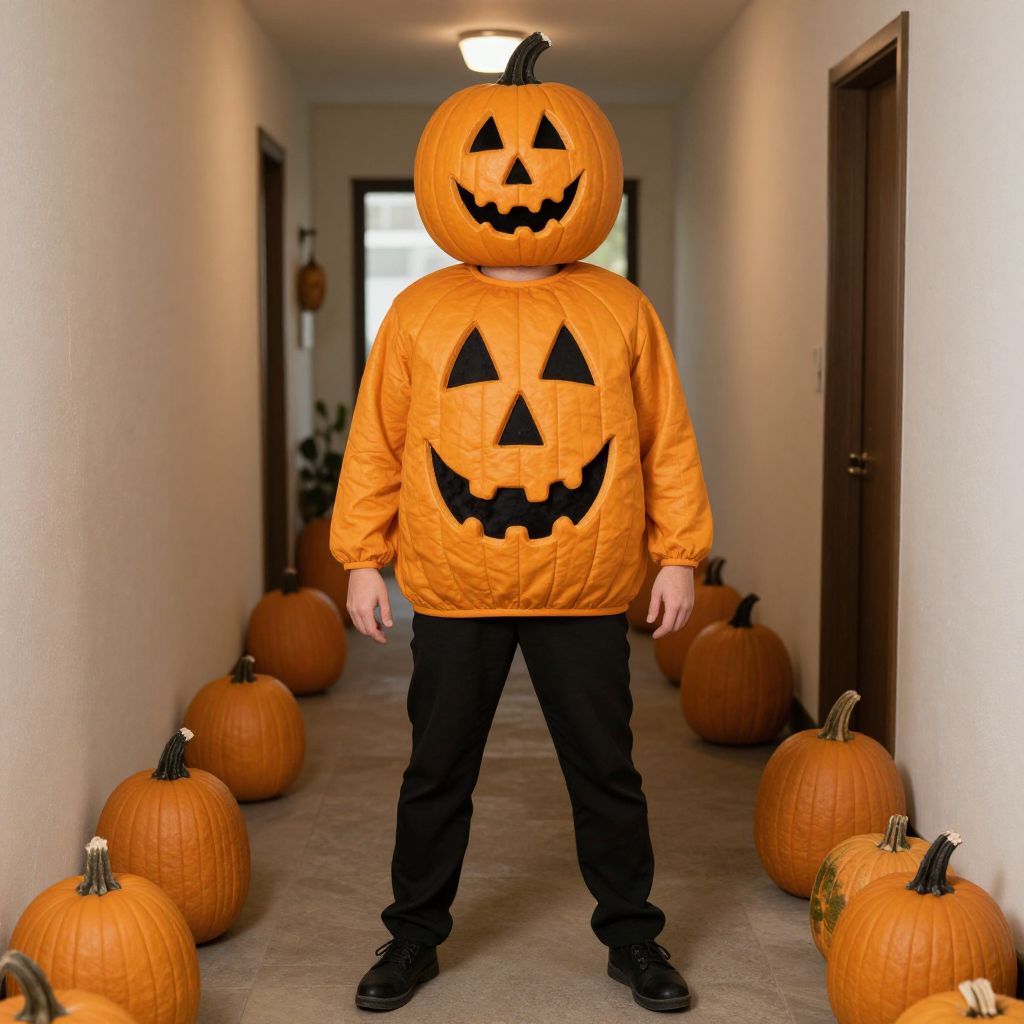 Peter Peter Pumpkin Eater Costume, man in a costume standing in a hallway with pumpkins