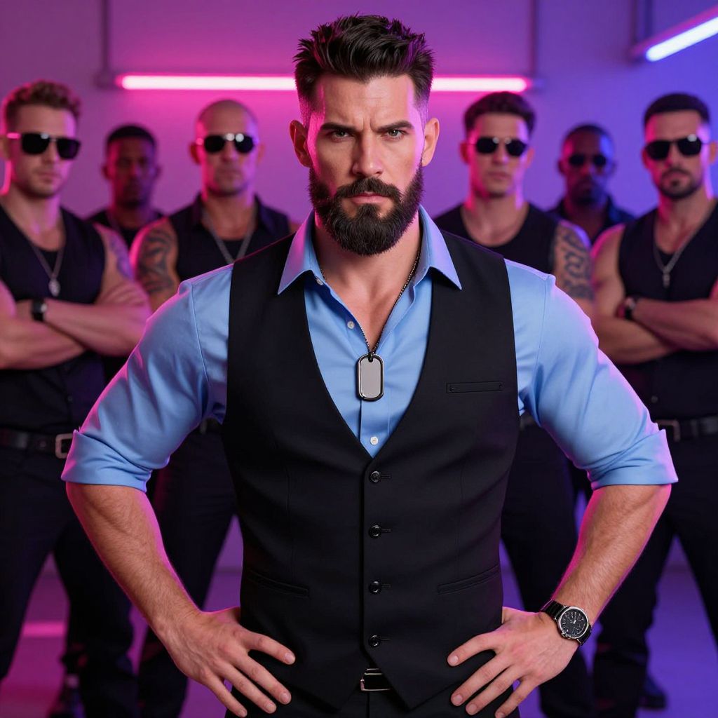 A digital art image of a serious, bearded man with short dark hair and a well-groomed beard, wearing a light blue shirt, black vest, and dog tags. He has a muscular build and is standing with his hands on his hips. In the background, six muscular men with sunglasses and tattoos stand with arms crossed, illuminated by pink and purple neon lights. The scene has a modern, slightly gritty feel.