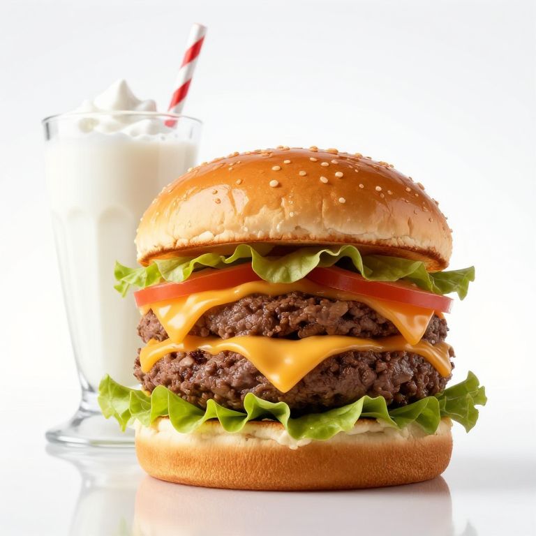 Photograph of a juicy double cheeseburger with lettuce, tomato, and melted cheese, beside a glass of milk with a red-and-white straw.