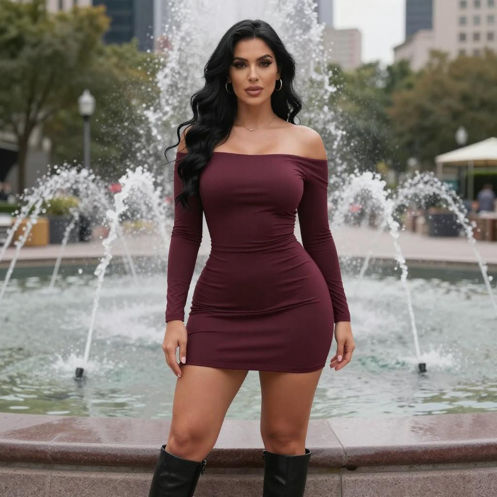 Photograph of a confident woman with long, wavy black hair standing in front of a bubbling fountain. She's wearing a tight, off-the-shoulder maroon mini dress that highlights her curvy figure, and black knee-high boots. The background shows a blurred cityscape with trees and buildings. The fountain's water arcs gracefully, adding a dynamic element to the urban setting.