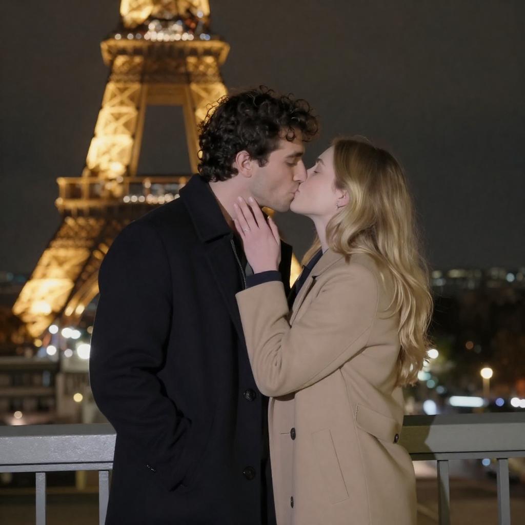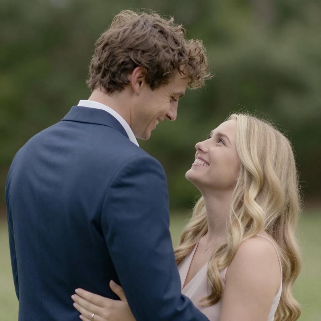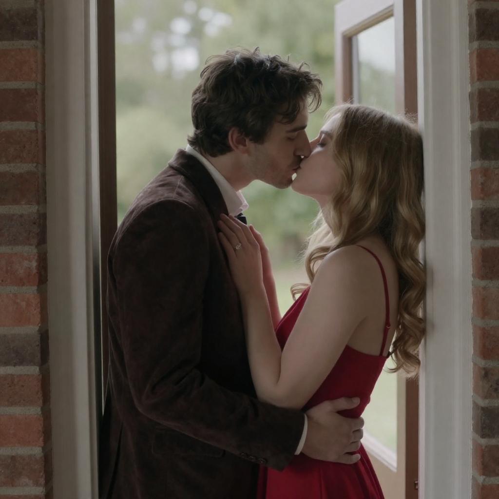 Photograph of a couple kissing. Man in blue suit, white shirt, with curly dark brown hair and trimmed beard. Woman with long blonde hair, wearing pink top and white floral skirt, embracing him. Background: greenery, blurred. Both eyes closed, soft expressions. Man's left hand on woman's back, woman's right hand on his chest. Outdoor setting.
