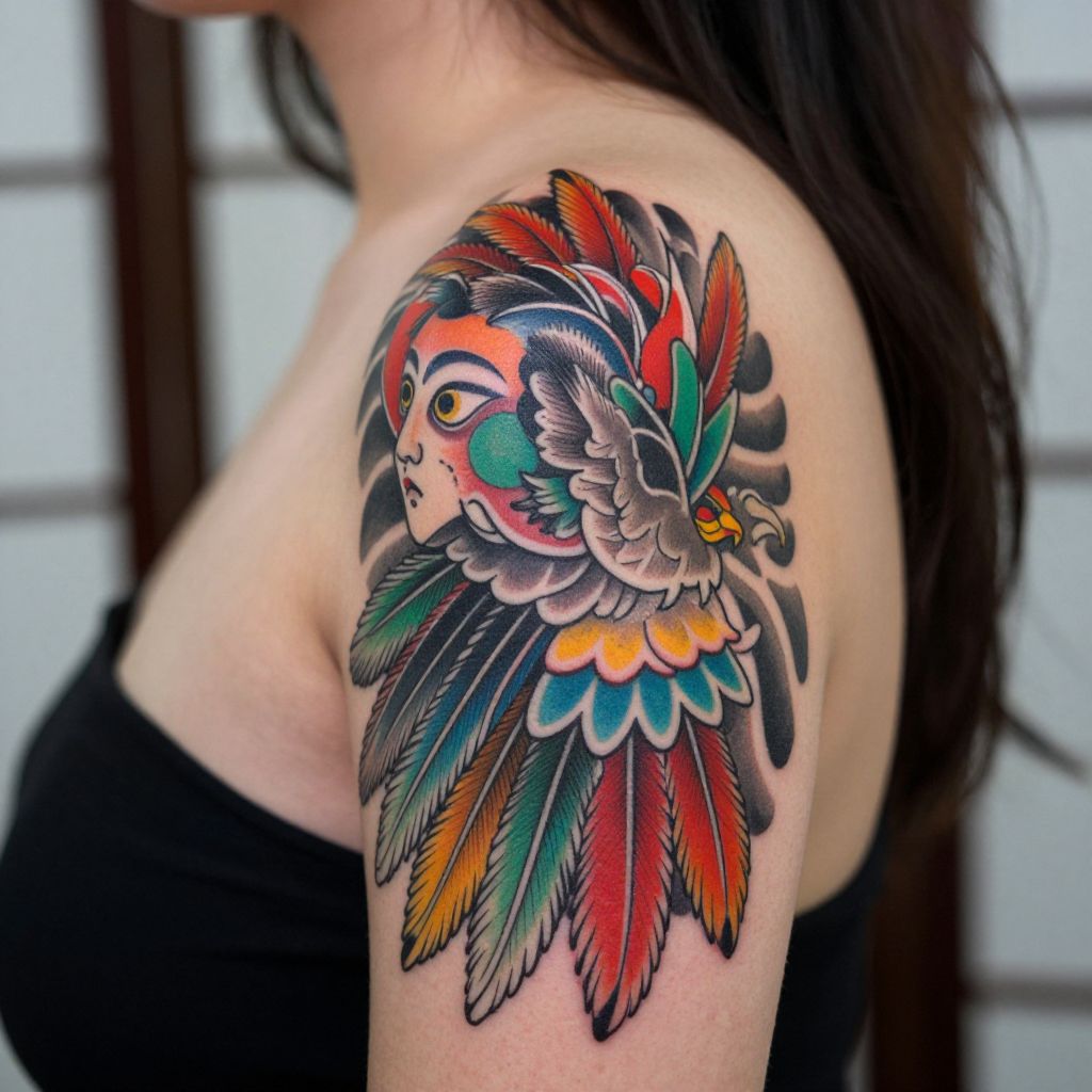This is a close-up photo of a person's shoulder and upper arm, showcasing a vibrant, detailed tattoo of a traditional Japanese-style bird with colorful feathers and a human face. The tattoo features bright reds, blues, greens, and yellows, with intricate shading and line work. The person's neck and dark brown hair are partially visible in the background. The overall style is bold and artistic.