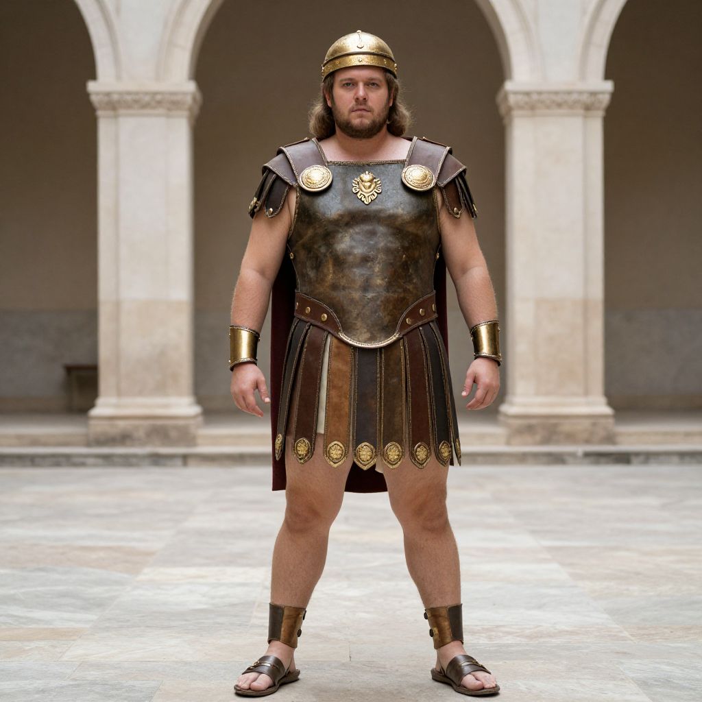 Plus Size Gladiator Costume, man dressed in roman costume standing in a courtyard