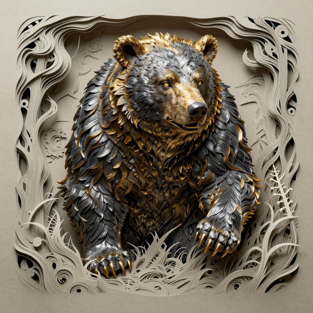 Ivory ebony gold silver sculpture of Werebear - A humanoid creature capable of transforming into a bear, often associated with strength and ferocity. Oleg Shuplyak, natural, shimmering, vibrant, gothic, rpg, 1400ad, ultra detailed, detailed, immersive, reminiscent of high fantasy RPG games, HD, masterpiece, best quality, hyper detailed, super realistic, perfect face, perfect hands, award-winning, professional, breathtaking, linquiveramagic Marshtroubled weatherthick layered papercut art of . deep 3D, volumetric, dimensional, depth, thick paper, high stack, heavy texture