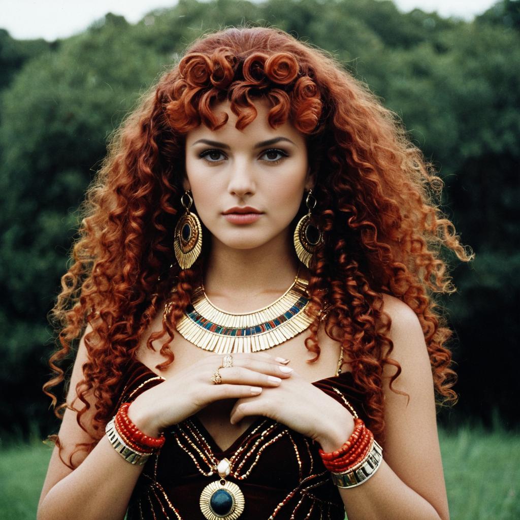 Woman in Foxy Cleopatra Inspired Outfit with Curly Red Hair