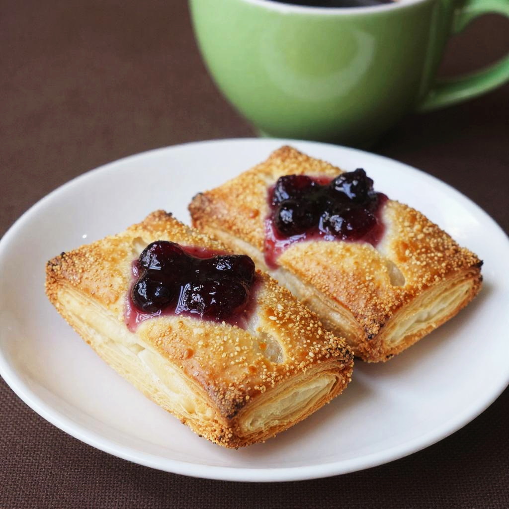 Photograph of two golden-brown, rectangular pastries with a generous dollop of dark red berry jam in the center, placed on a white plate. The plate is on a brown, textured tablecloth, with a bright green, glossy teacup in the blurred background. The pastries look freshly baked, with a slightly crispy, crunchy texture. The overall vibe is cozy and appetizing.