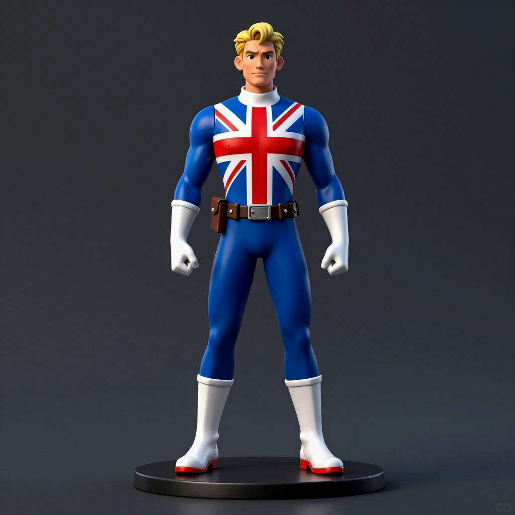 Male superhero statue, standing, full-body. Wears tight blue and white suit with Union Jack pattern on chest, red accents. Blonde hair, short. Brown belt with pouches, metal buckle. White boots with red and blue details. Neutral expression. Dark gray background. Full-body, muscular build, confident stance. 3D illustration style. Statue on black circular base. Hands clenched, standing upright.