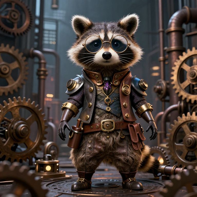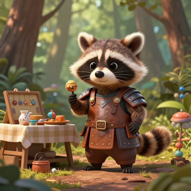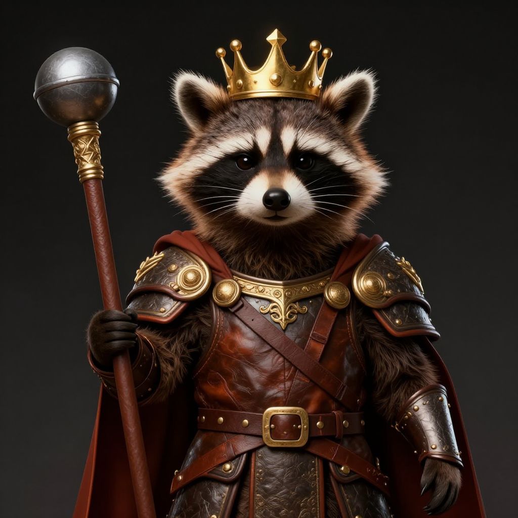 Raccoon knight guarding an ancient stone gate in a mystical forest, ornate armor covered in moss and vines, twilight ambiance with fireflies, realistic fur rendering
