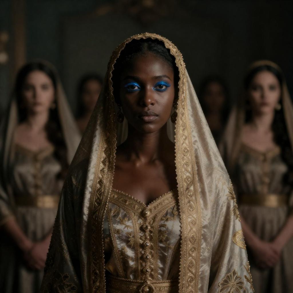 Masterpiece, best quality, realistic, 1boy, fortune teller, tarot cards at a table, looking at viewer, dark skin, mystical, magical, glow, glowing, dark magical lighting, moody, cinematic, sparkle, glittering, darkness